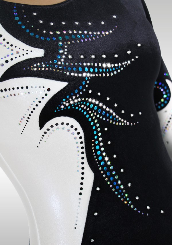 Justaucorps manches longues en wetlook blanc combiné avec du velours noir. Un motif superbe en paillettes rutquoises et argentées sur le devant et sur le dos.